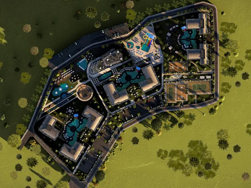 The complex consists of 7 blocks and a 5-star hostel with 100 rooms. Owners of the apartments can use the extensive infrastructure of the complex and hotel infrastructure, while hotel guests can only use the hotel facilities. Everything is available on the estate, which will allow you to relax and live comfortably. Each block has internal amenities and an outdoor pool. The project paid special attention to sports and entertainment areas. The area includes basketball courts, volleyball courts, a tennis court, mini golf, a fountain with lights and music, a water park, a mini club-amphitheater and much more. The five-star hotel will be open all year round, and apartment owners will be able to order meals in bars and restaurants at discounted prices.